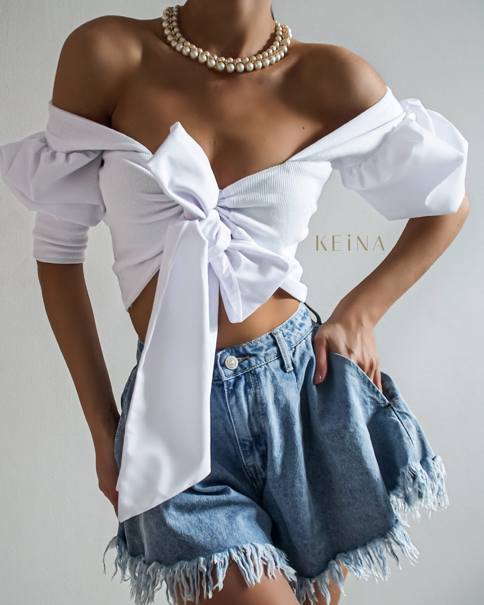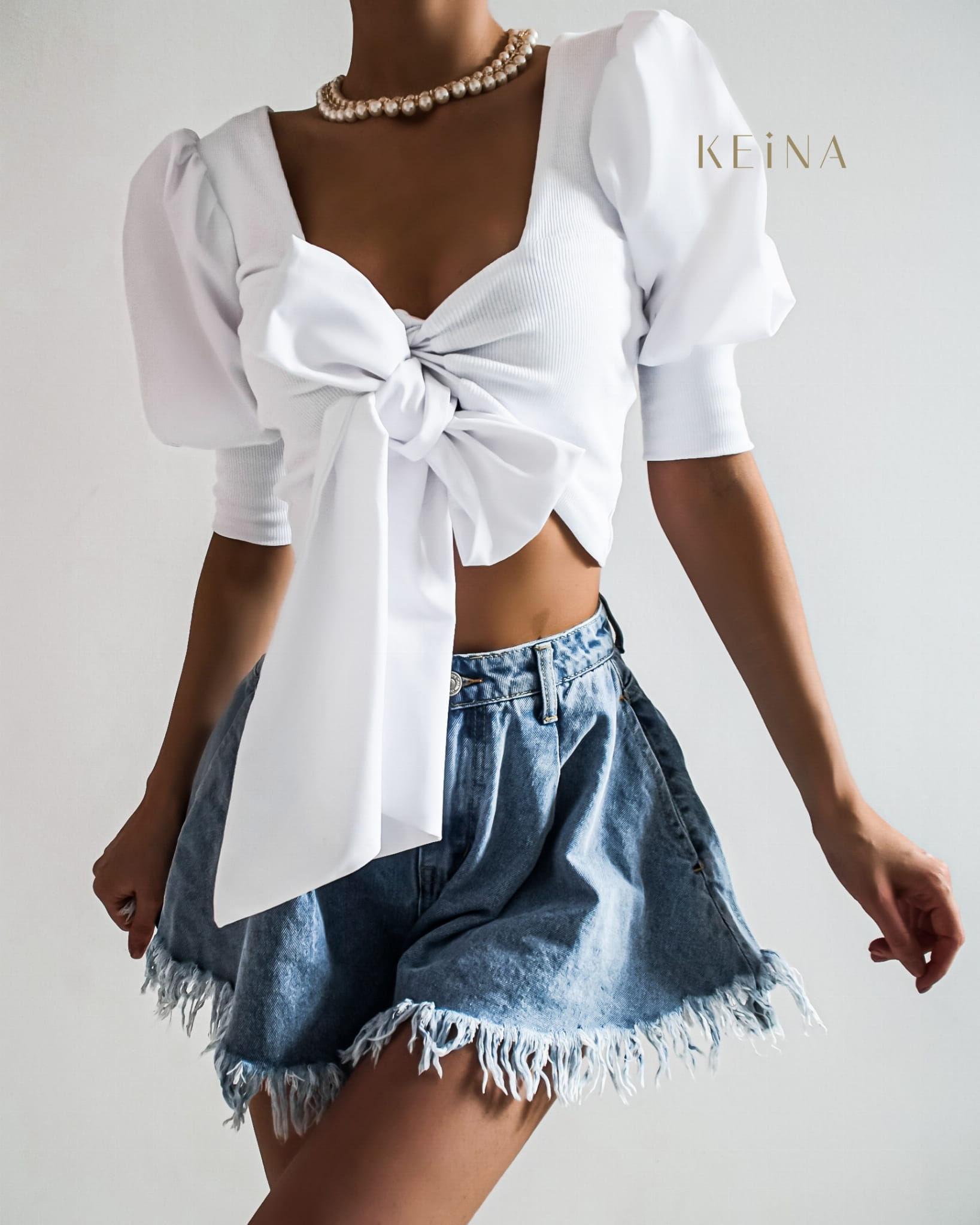 Bluzka Rosalia - kokarda jest wiązana, może być z przodu lub na plecach. Piękna i bardzo wygodny przyjemny materiał :) Idealna na cieplejsze dni, do spódnicy, spodni, szortów.