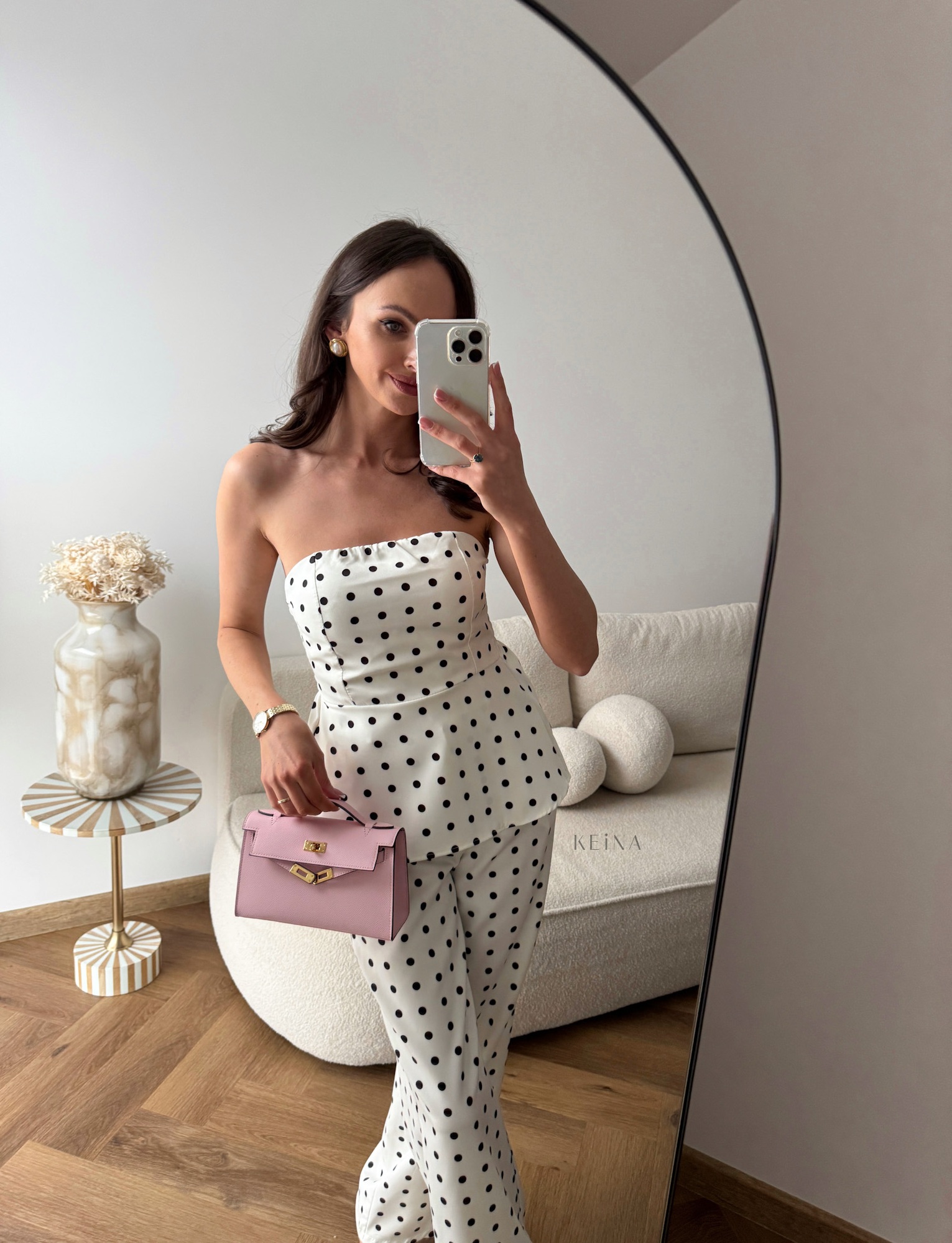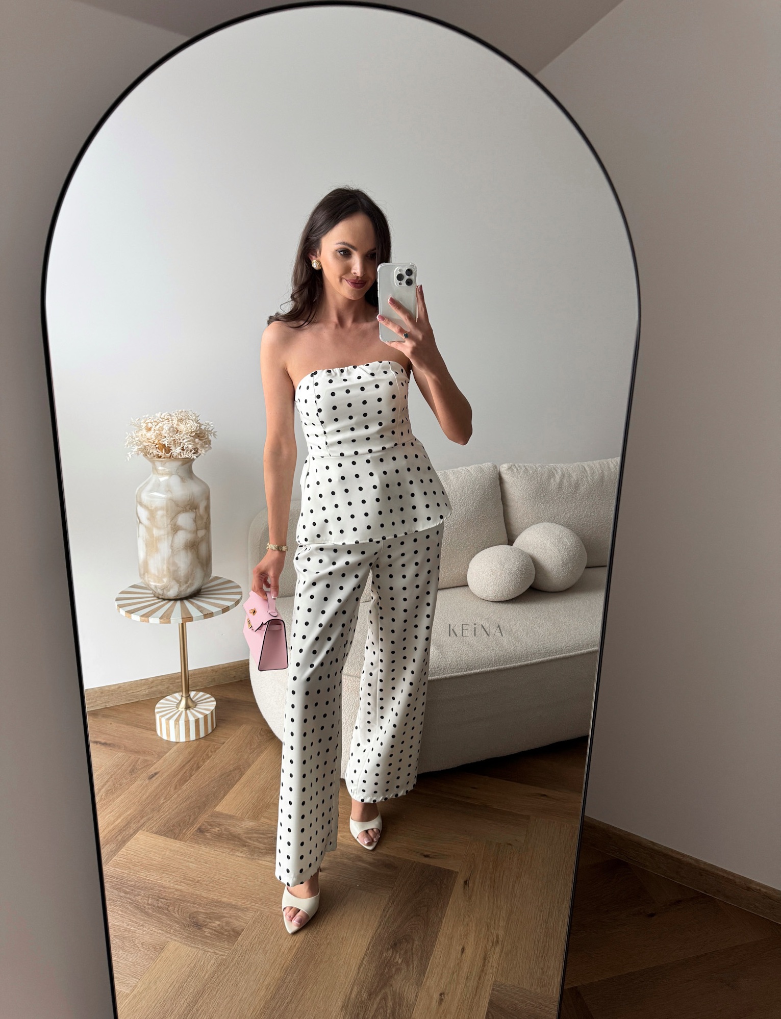 Komplet Lario - Bluzka z baskinką w połączeniu ze spodniami w najmodniejszy print sezonu – grochy. To harmonijne zestawienie kobiecości i elegancji, które przyciąga uwagę i nadaje stylizacjom wyrazistego charakteru. Poszczególne elementy możesz dowolnie łączyć, tworząc wiele różnorodnych looków.