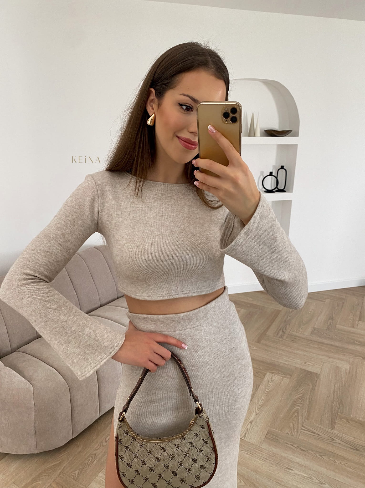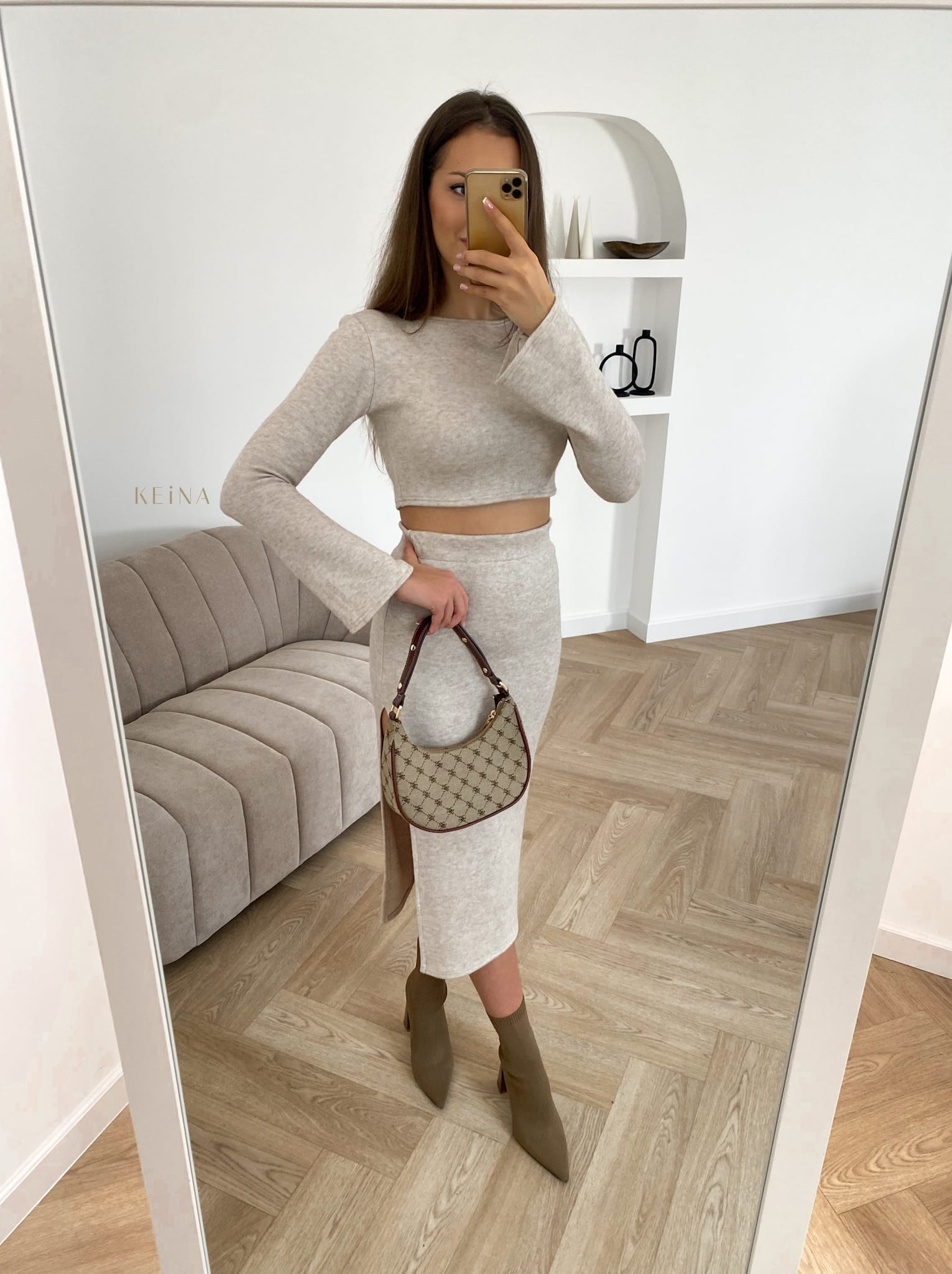 Komplet Loe Beige - Dzianinowa spódnica + top. Spódnica podkreśla sylwetkę, jest z wysokim stanem, a dodatkowo bokiem jest rozcięta i wydłuża nogi. Top ma delikatnie rozkloszowane rękawy. Całość jest bardzo wygodna, materiał przyjemny i miły w noszeniu :) Uszyty w Polsce .