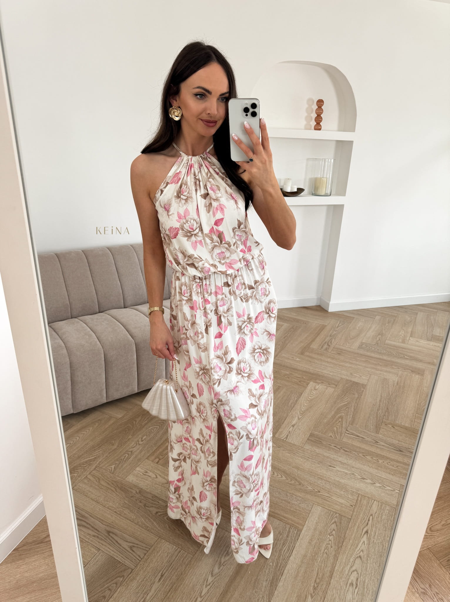 Sukienka Gaia - Zwiewna maxi sukienka z lekkiej wiskozy, ozdobiona delikatnym, kwiatowym printem. Jej swobodny krój subtelnie podkreśla kobiecość, a zmysłowe rozcięcie na nodze i wiązanie na szyi dodają jej romantycznego uroku.