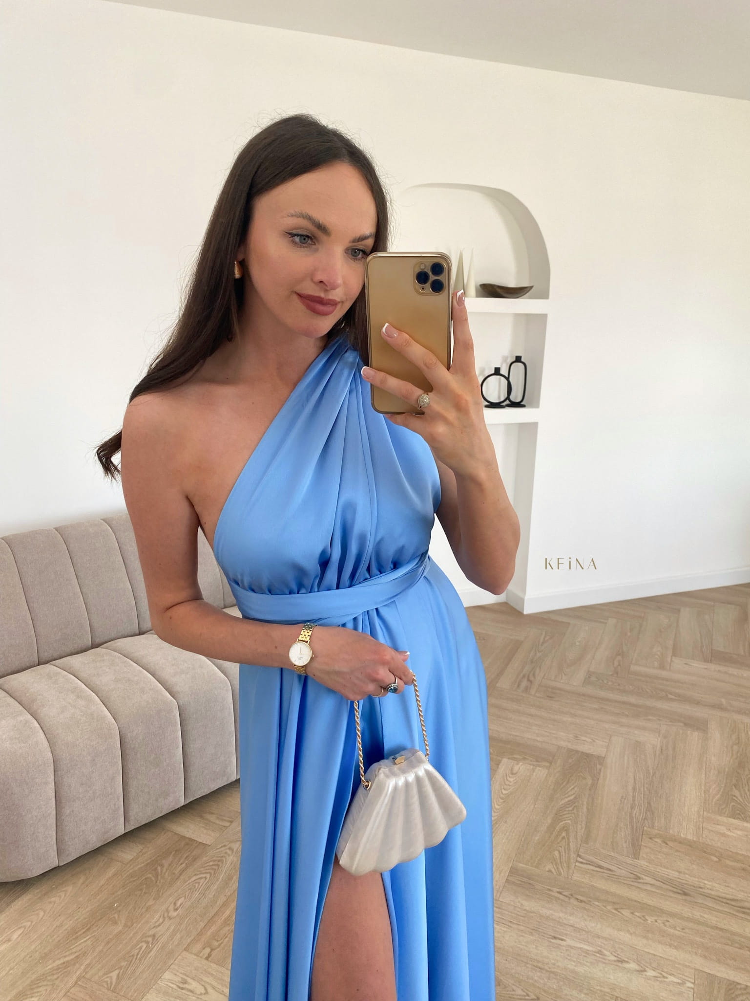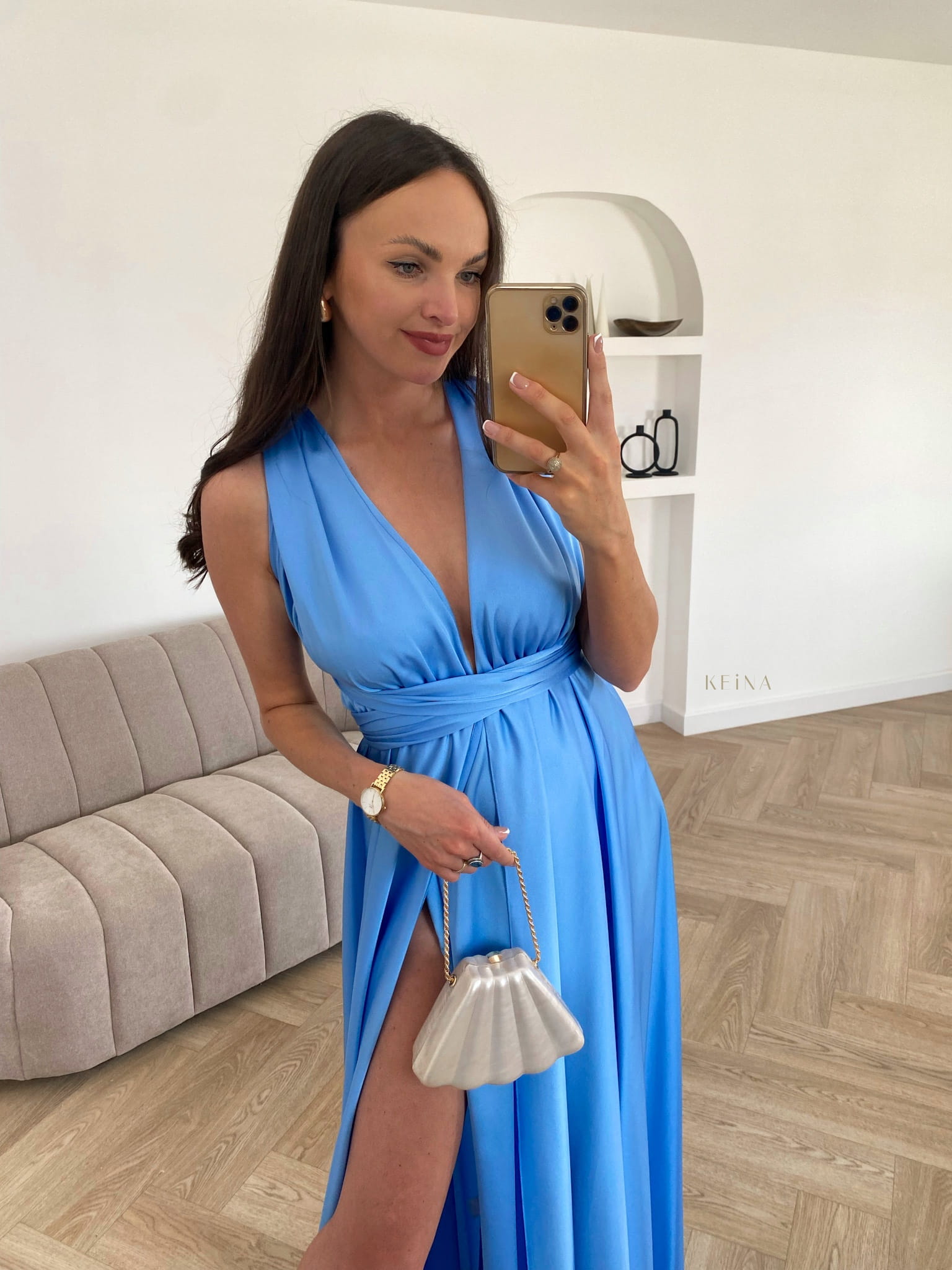 Sukienka Lovi Blue - elegancka sukienka, która zachwyca. Klasyka i ponadczasowy krój, osobiście sprawdziliśmy i zmierzyliśmy ją na 5 sylwetkach, dzięki wiązaniom sukienkę można pięknie u góry dopasować według uznania, zrobić mniejszy lub większy dekolt, lub założyć na bok (bez dekoltu). W talii jest gumka która sama się dopasowuje. Natomiast dół sukienki delikatnie opada lejącym materiałem, wydłużając nogi. Wystarczy dołożyć prostą kopertówkę, delikatne szpilki i całość wygląda mega kobieco i z klasą. A odkryte plecy dodają zmysłowego akcentu.