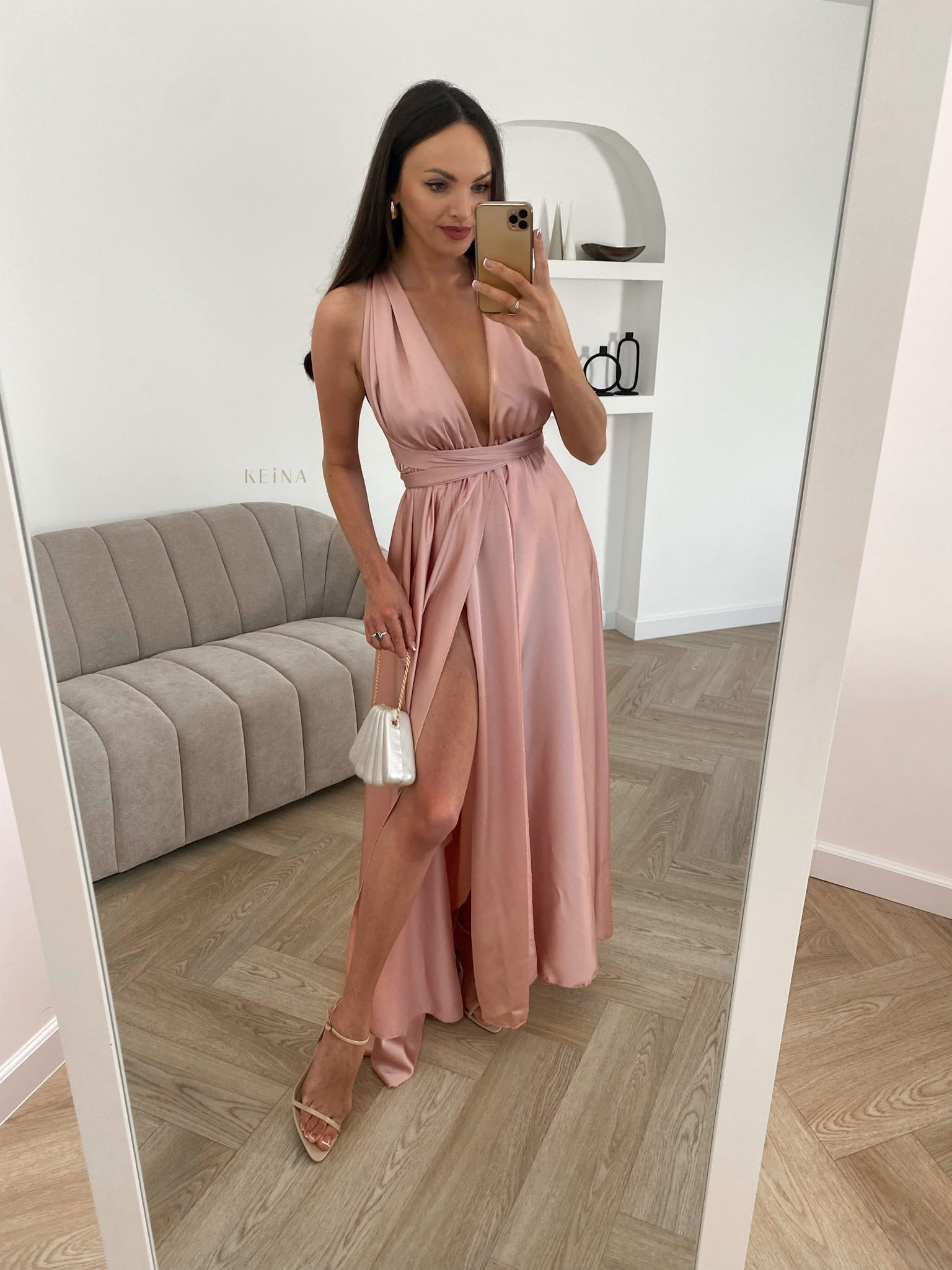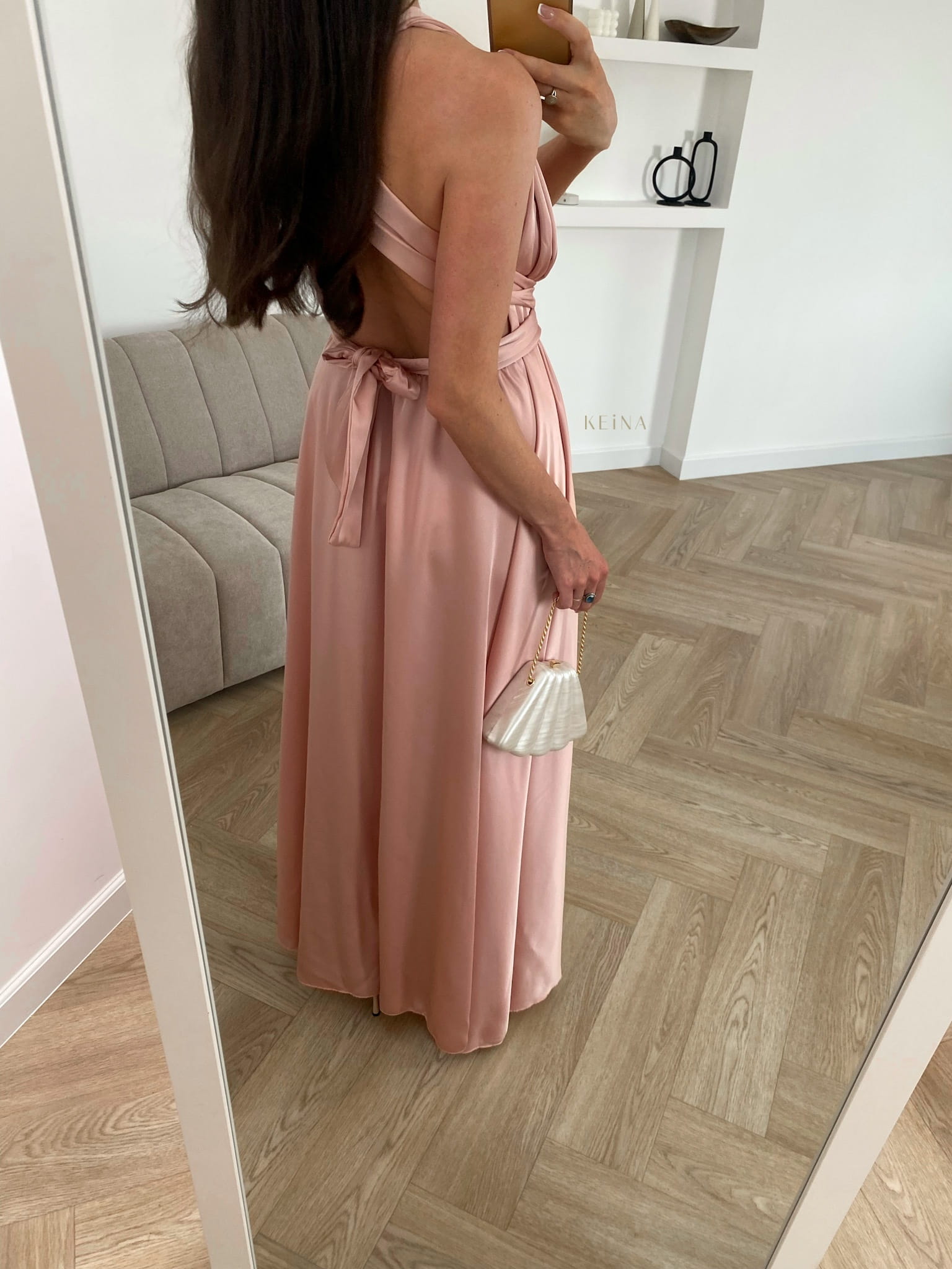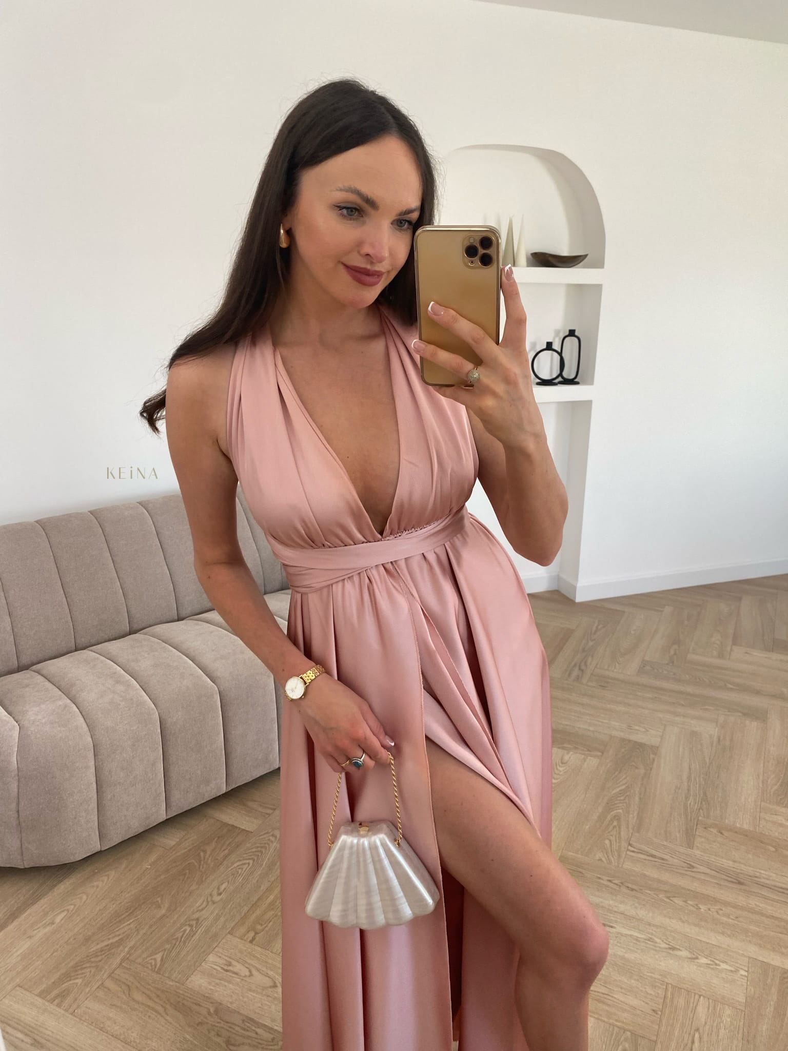 Sukienka Lovi Pink - elegancka sukienka, która zachwyca. Klasyka i ponadczasowy krój, osobiście sprawdziliśmy i zmierzyliśmy ją na 5 sylwetkach, dzięki wiązaniom sukienkę można pięknie u góry dopasować według uznania, zrobić mniejszy lub większy dekolt, lub założyć na bok (bez dekoltu). W talii jest gumka która sama się dopasowuje. Natomiast dół sukienki delikatnie opada lejącym materiałem, wydłużając nogi. Wystarczy dołożyć prostą kopertówkę, delikatne szpilki i całość wygląda mega kobieco i z klasą. A odkryte plecy dodają zmysłowego akcentu.