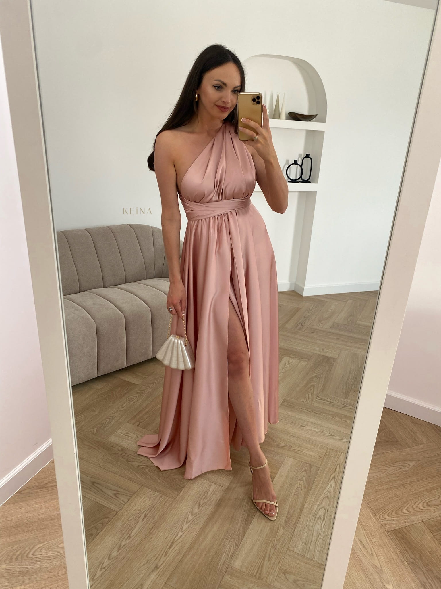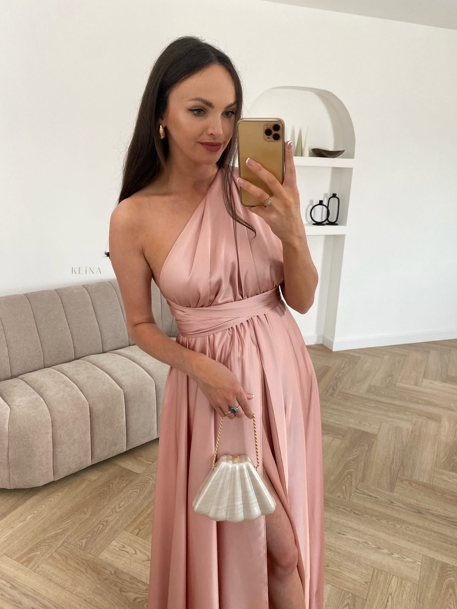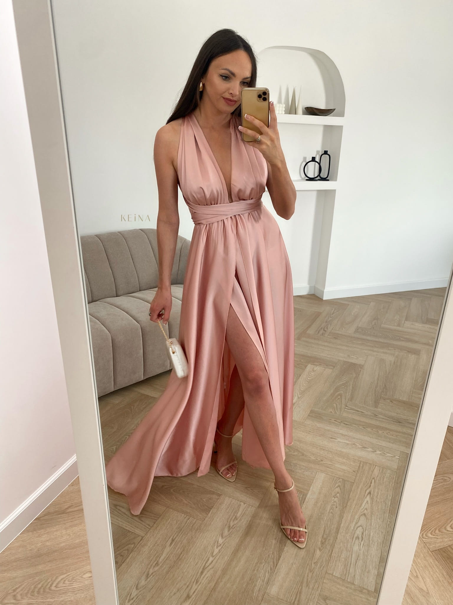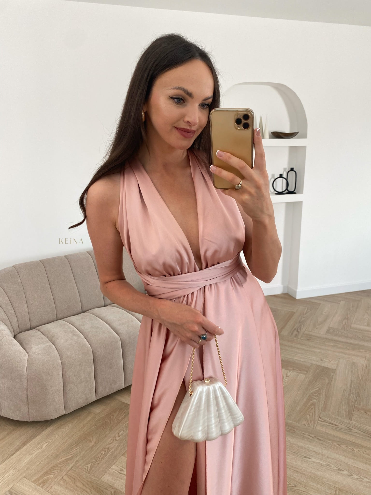 Sukienka Lovi Pink - elegancka sukienka, która zachwyca. Klasyka i ponadczasowy krój, osobiście sprawdziliśmy i zmierzyliśmy ją na 5 sylwetkach, dzięki wiązaniom sukienkę można pięknie u góry dopasować według uznania, zrobić mniejszy lub większy dekolt, lub założyć na bok (bez dekoltu). W talii jest gumka która sama się dopasowuje. Natomiast dół sukienki delikatnie opada lejącym materiałem, wydłużając nogi. Wystarczy dołożyć prostą kopertówkę, delikatne szpilki i całość wygląda mega kobieco i z klasą. A odkryte plecy dodają zmysłowego akcentu.