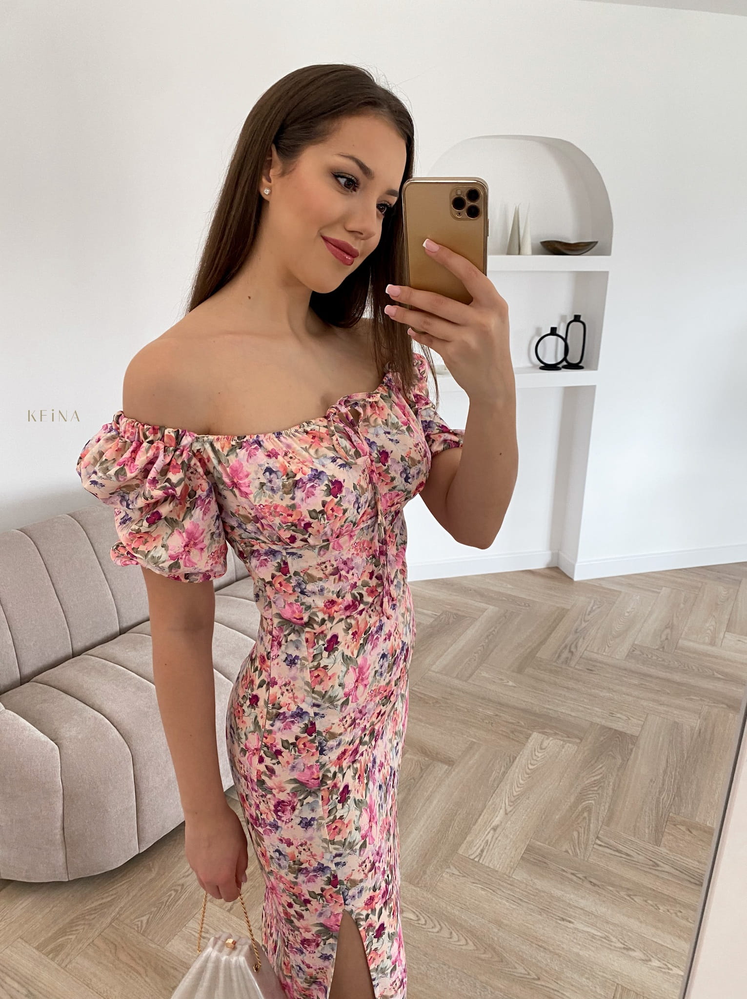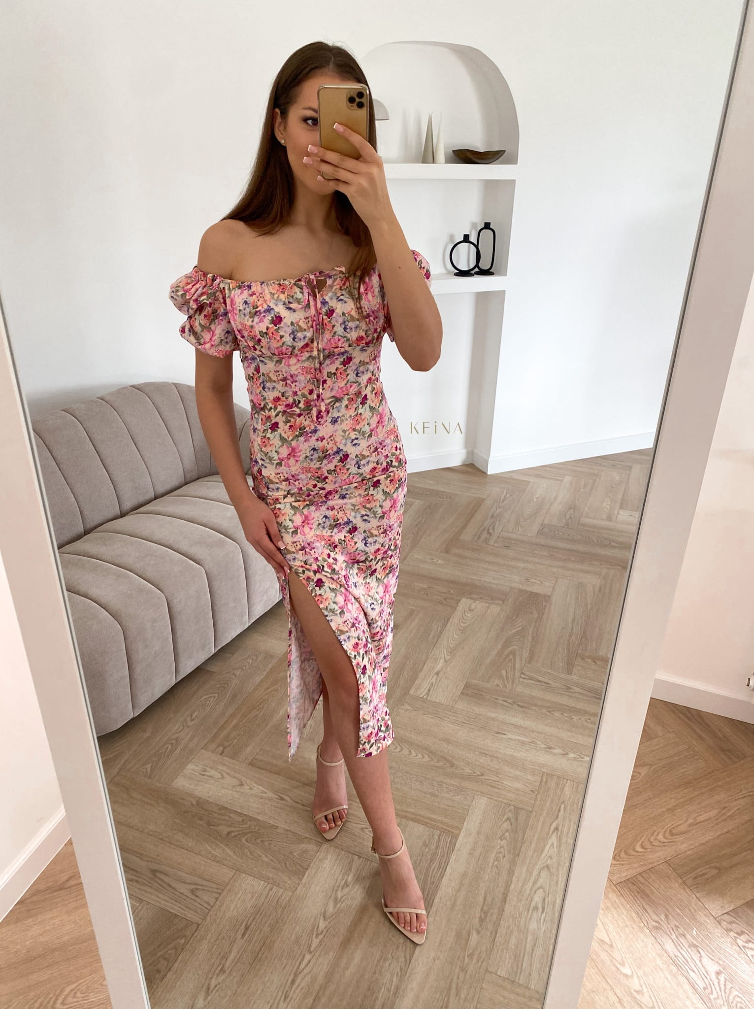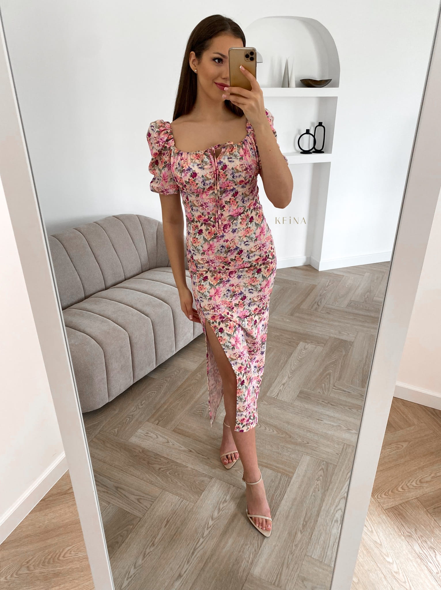 Sukienka Merci - midi, dopasowana w piękny kwiecisty print :) Rękawy można nosić na dwa sposoby, a przy dekolcie jest wiązana. Jest kobieca i subtelna, założysz ją na większe wyjście ale również latem do sandałek i klapek! :)